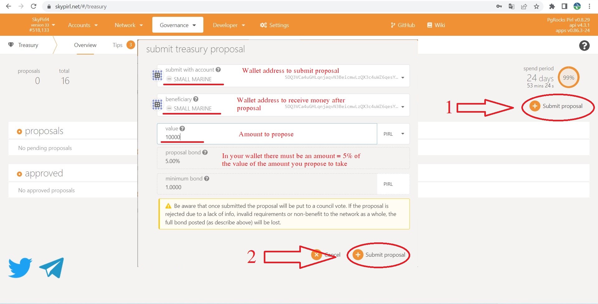 **Note:** The proposer's wallet will be locked 5% of the proposed amount. If the proposal is successful you will be returned 5%. If the proposal fails you will lose 5%, this money will be burned and you cannot get it back. This will keep people from spamming the treasury. For example you propose 1000 Pirl coin, then you will be locked 50 Pirl.