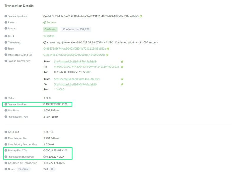 Here is an interaction with a smart contract involving a transfer fee of 0.1083893 CLO, of which 0.108 CLO were burned, and a priority fee of 0.0001623 CLO was paid to the miners.
